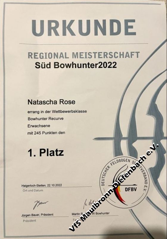 Bei bestem Wetter trafen sich 168 Bogenschützen und fanden einen "knackig" gestellten Parcours vor. 7km, 38 Stockwerke, 14x 3-Pfeil und 14x Doppelhunter galt es zu absolvieren. Am Ende konnte Natascha Rose ihr beständig sehr gutes Niveau ausspielen und Gewann ihre BHR Klasse. Somit kommt der Süddeutsche Meistertitel zur diesjährigen Titelsammlung hinzu.