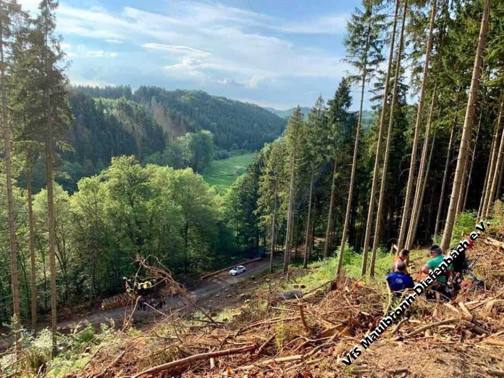 Am Freitag ging es dann gleich sportlich für die Schützen los: Strahlender Sonnenschein, 30°C Außentemperatur und ein Gelände, so hügelig und anspruchsvoll zu besteigen, das dem Westerwald alle Ehre macht. Erschwerend kam die vorangegangene partielle Abholzung des Waldes hinzu, welche dem Borkenkäfer zu verdanken ist. Somit ging es im wahrsten Sinne über Stock und Stein.