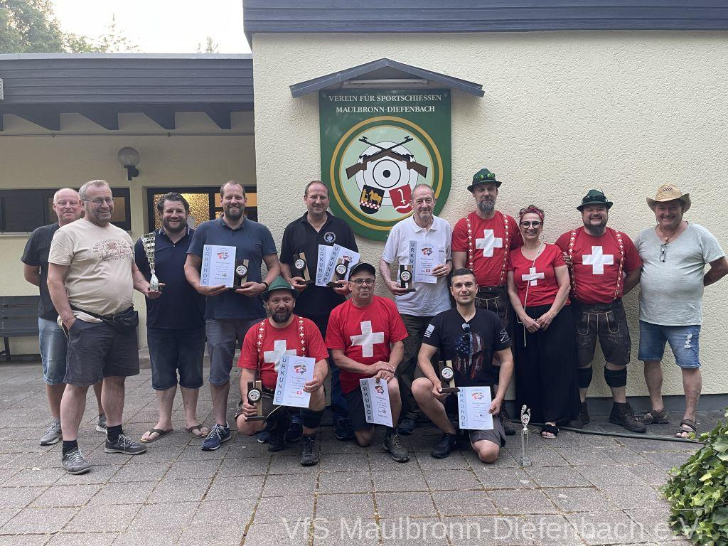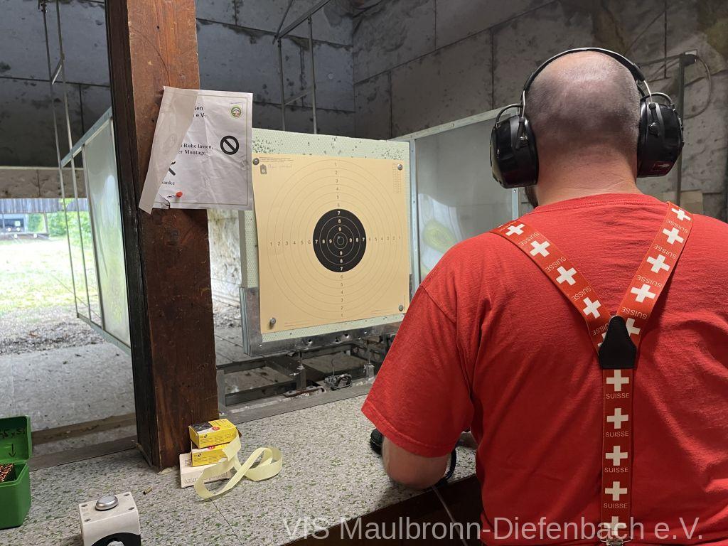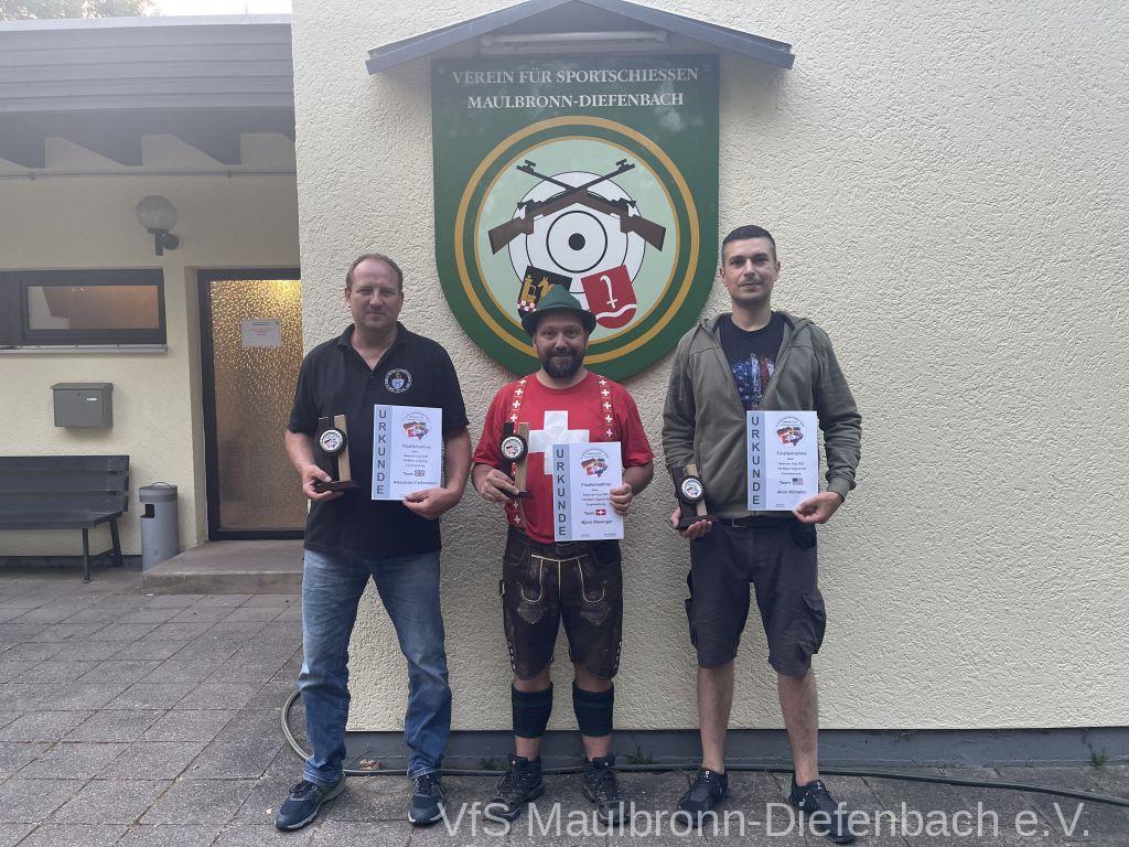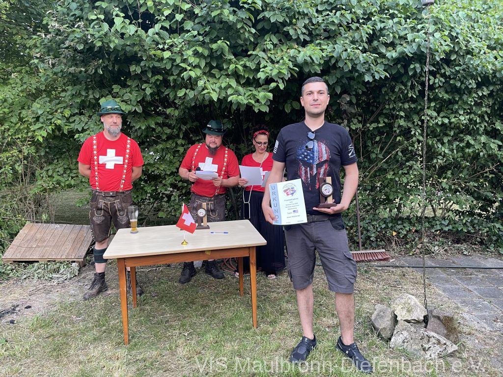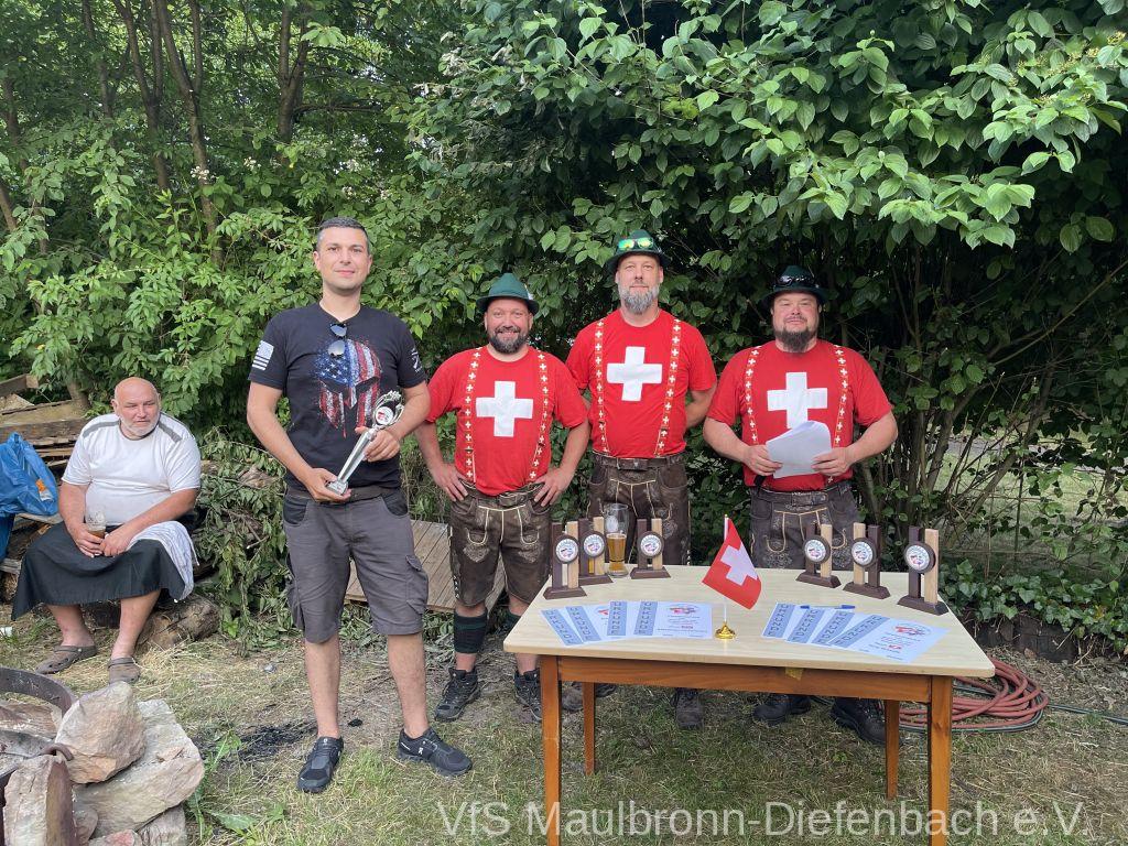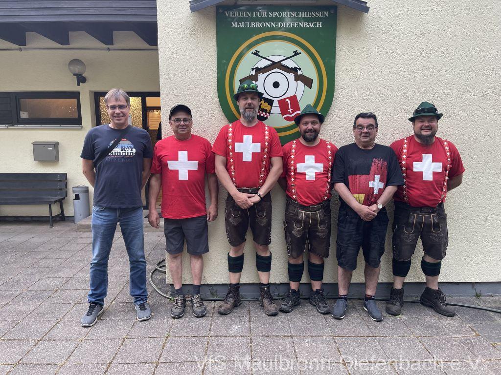 In der 100m Disziplin konnte sich Björn Riexinger überragend durchsetzen. Er schoss mit 11 Ringen Vorsprung und im stehend Durchgang mit 66,1 Ringen ein hervorragendes Ergebnis. Mit insgesamt 134,1 Ringen war er an diesem Tag unschlagbar. Auf Platz 2 mit 123,1 Ringen platzierte sich Alexander Falkenstein. Platz 3 mit 121,1 Ringen ging sichtbar knapp an Aron Kicherer. Platz 4 mit einer nicht genannten Ringzahl belegte wieder Tony Bracale. Aber für ihn hatten sich seine Schweizer Teamkameraden noch eine besondere Überraschung ausgedacht. Als einziger echter Schweizer im Verein war es eine Frage der Zeit, bis er im rein schweizer Nationen-Cup-Orga-Team aufgenommen wurde. Seine langjährige Erfahrung als Kreissportleiter werden bestimmt von Nutzen sein. Besiegelt wurde es mit der Verleihung des Schweizer Shirts, das Tony sofort überstreifte.
