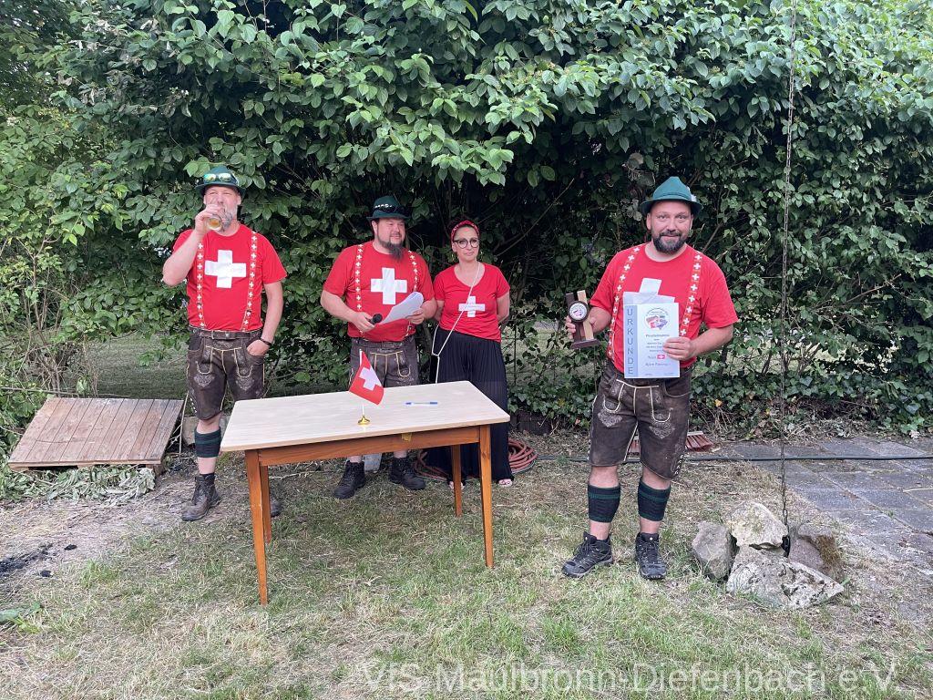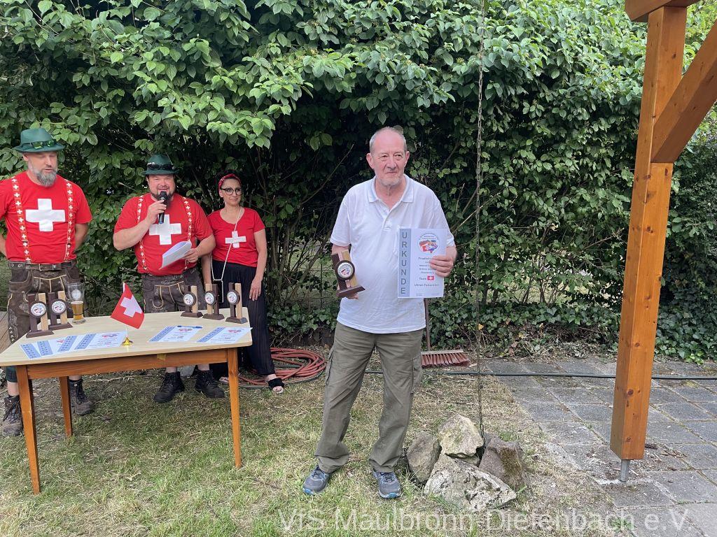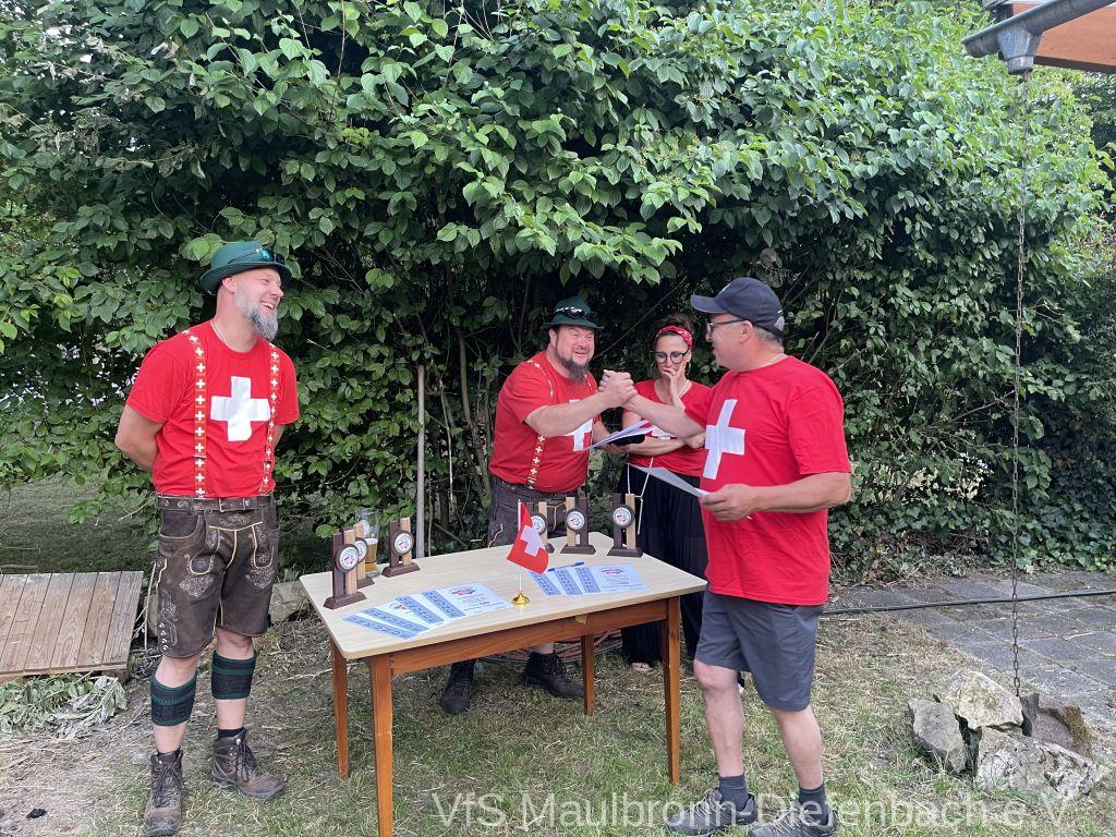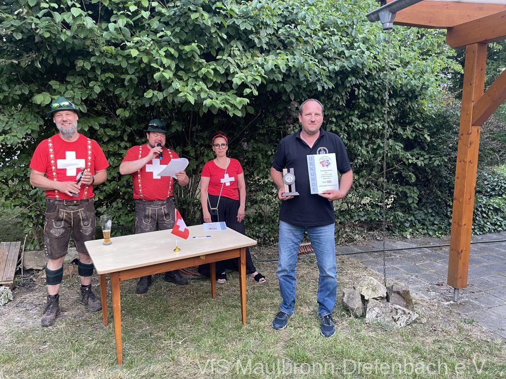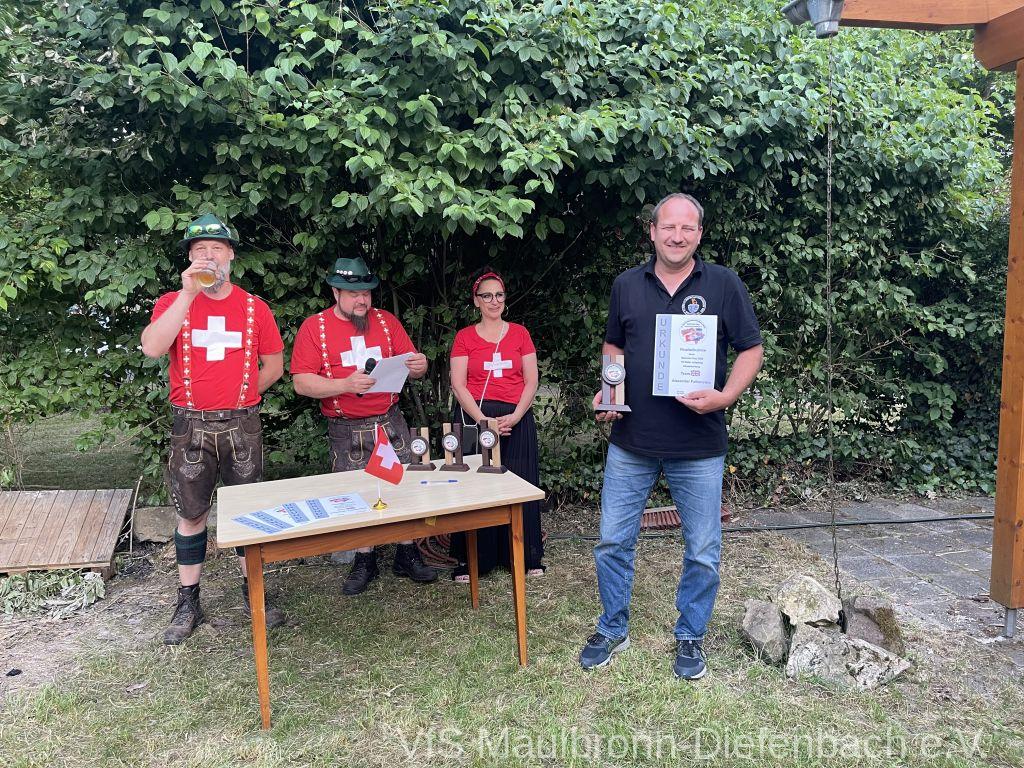 In der 100m Disziplin konnte sich Björn Riexinger überragend durchsetzen. Er schoss mit 11 Ringen Vorsprung und im stehend Durchgang mit 66,1 Ringen ein hervorragendes Ergebnis. Mit insgesamt 134,1 Ringen war er an diesem Tag unschlagbar. Auf Platz 2 mit 123,1 Ringen platzierte sich Alexander Falkenstein. Platz 3 mit 121,1 Ringen ging sichtbar knapp an Aron Kicherer. Platz 4 mit einer nicht genannten Ringzahl belegte wieder Tony Bracale. Aber für ihn hatten sich seine Schweizer Teamkameraden noch eine besondere Überraschung ausgedacht. Als einziger echter Schweizer im Verein war es eine Frage der Zeit, bis er im rein schweizer Nationen-Cup-Orga-Team aufgenommen wurde. Seine langjährige Erfahrung als Kreissportleiter werden bestimmt von Nutzen sein. Besiegelt wurde es mit der Verleihung des Schweizer Shirts, das Tony sofort überstreifte.