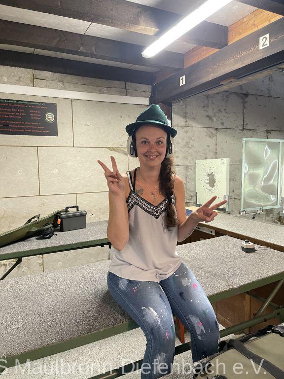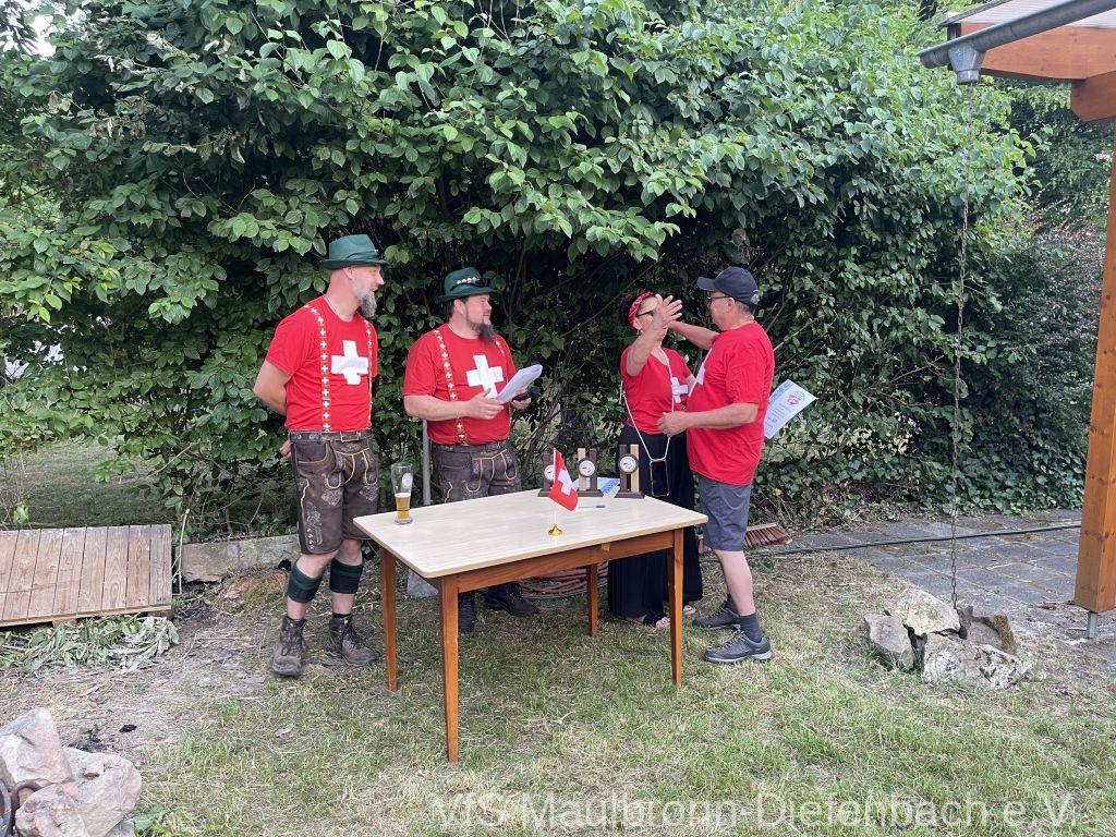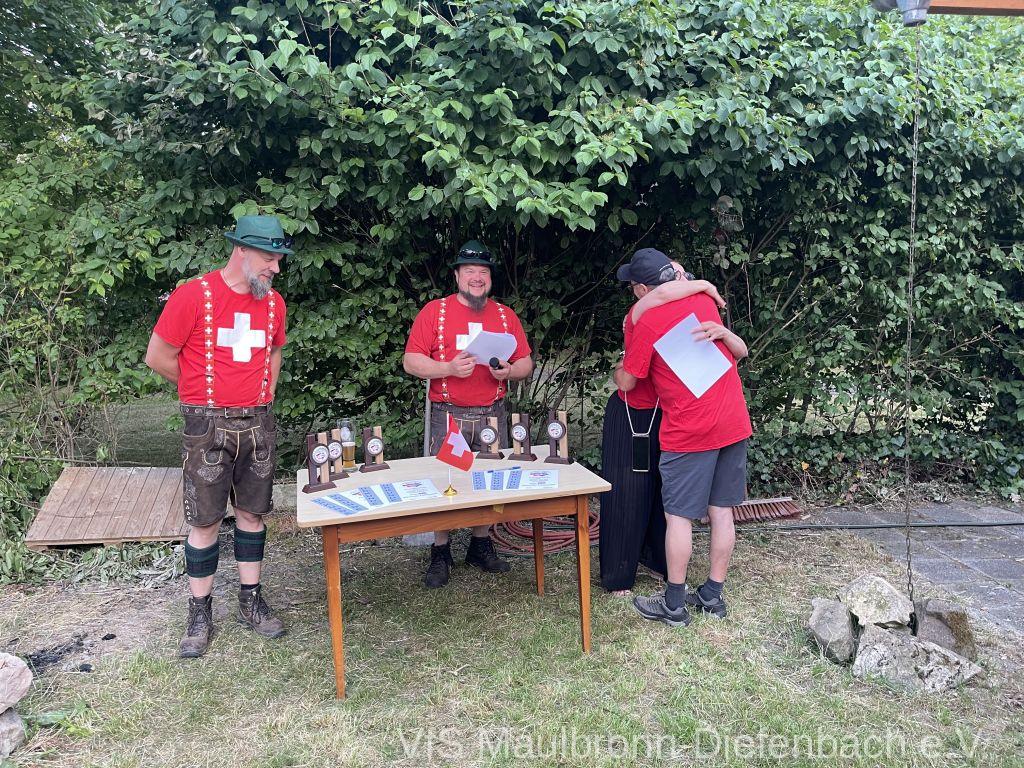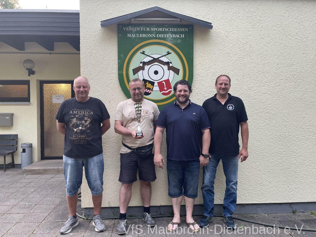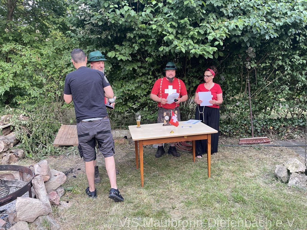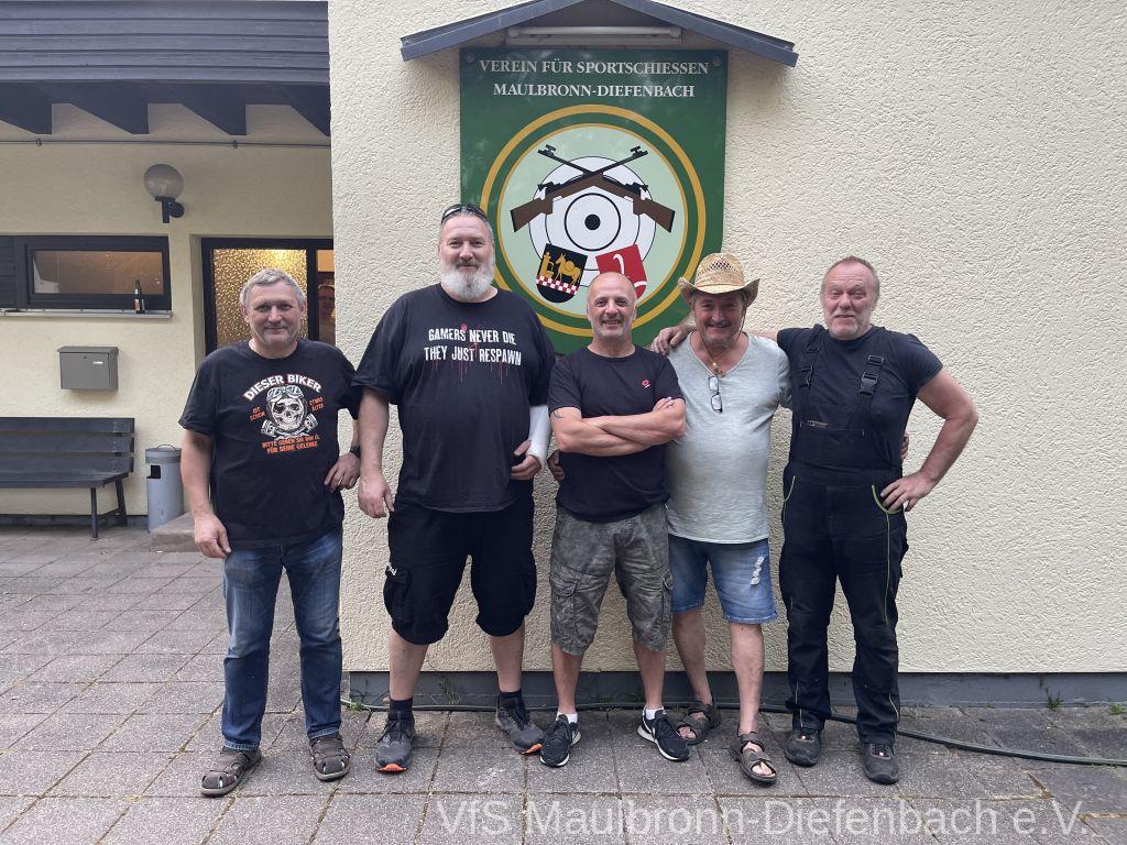 In der 100m Disziplin konnte sich Björn Riexinger überragend durchsetzen. Er schoss mit 11 Ringen Vorsprung und im stehend Durchgang mit 66,1 Ringen ein hervorragendes Ergebnis. Mit insgesamt 134,1 Ringen war er an diesem Tag unschlagbar. Auf Platz 2 mit 123,1 Ringen platzierte sich Alexander Falkenstein. Platz 3 mit 121,1 Ringen ging sichtbar knapp an Aron Kicherer. Platz 4 mit einer nicht genannten Ringzahl belegte wieder Tony Bracale. Aber für ihn hatten sich seine Schweizer Teamkameraden noch eine besondere Überraschung ausgedacht. Als einziger echter Schweizer im Verein war es eine Frage der Zeit, bis er im rein schweizer Nationen-Cup-Orga-Team aufgenommen wurde. Seine langjährige Erfahrung als Kreissportleiter werden bestimmt von Nutzen sein. Besiegelt wurde es mit der Verleihung des Schweizer Shirts, das Tony sofort überstreifte.