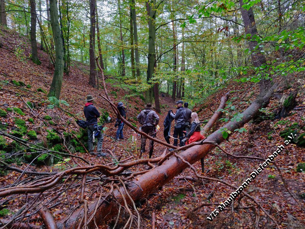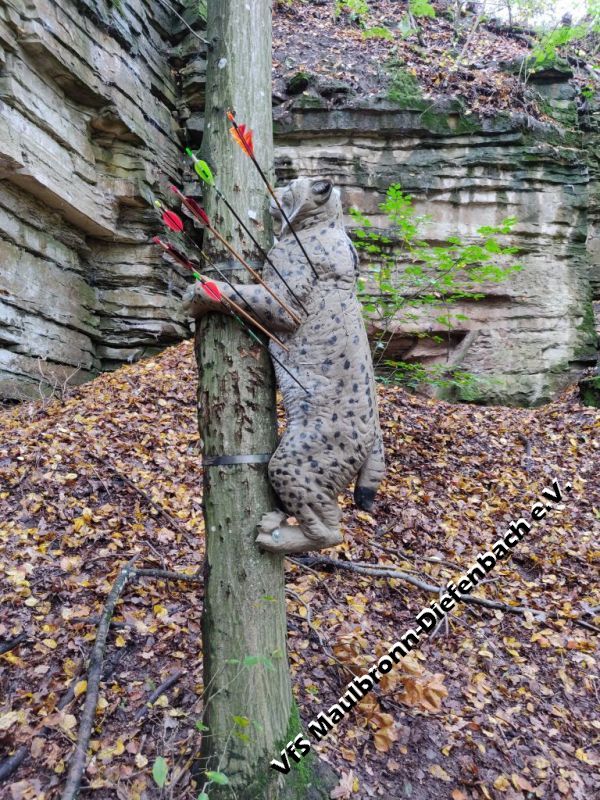 Getreu dem Motto „es gibt kein falsches Wetter, nur die falsche Kleidung“, trotzten letzten Samstag rund 200 Bogenschützen der feuchten Witterung und fanden sich in unserem malerischen Klosterstädtchen ein. Ein paar Schützen reisten bereits am Vortag mit Wohnmobil und -wagen an. Pünktlich zu Schießbeginn um 9:30 Uhr, welcher durch einen lautstarken Böllerschuss unseres Vereinskollegen Christian Combe verkündet wurde, hörte der Regen glücklicherweise auf. Wieder einmal führte der Parcours über die Felder und durch den Wald rund um das Schützenhaus herum. Durch den starken Regen im Vorfeld, waren einzelne Abschnitte ziemlich schlammig, aber auch ein festes Schuhwerk gehören zur Standardausrüstung eines Bogenschützen. Somit hatte dieser Umstand durchaus ebenfalls seinen Reiz, nebst den herausfordernd gestellten 3D Zielen und der wundervollen herbstlich eingefärbten Landschaft. Die Laune war allgemein sehr gut und der Parcours wurde wieder einmal hoch gelobt. Insbesondere eines unserer neuen Zielen, die Nummer 25 von 32. Hierbei handelte es sich um ein Krokodil, welches an einem Tümpel auf einer scheinbar einsamen Lichtung in Szene gesetzt wurde. Nebst dieser ruhigen, malerischen Kulisse, bot dieses Ziel einen interessanten Schuss über das Wasser. Zu niedrig gezielt, landet der Pfeil im Wasser.