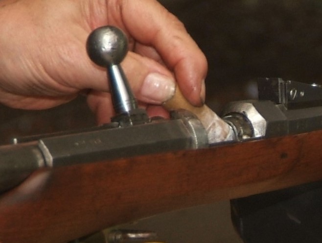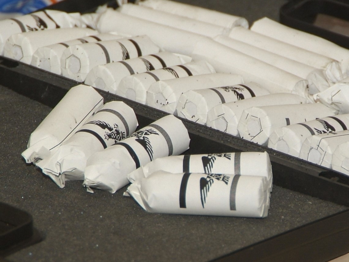 Hier wird mit selbst gewickelten Papierpatronen geschossen. Diese werden mit einer Nadel und einem Zündhütchen gezündet.